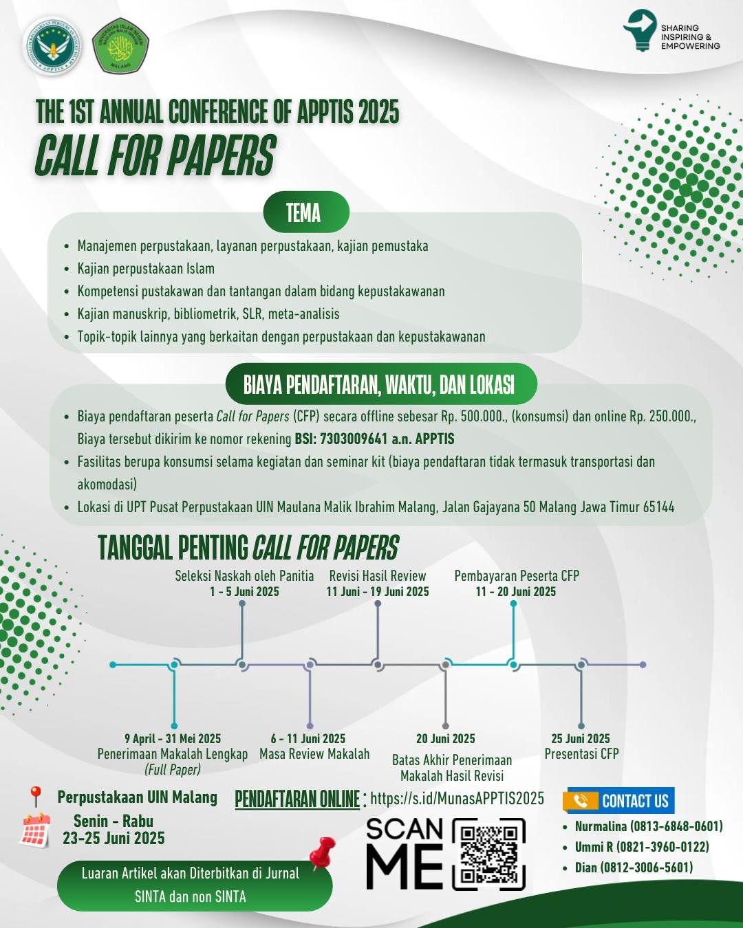 Selamat datang di The 1st Annual Conference of APPTIS. Konferensi ini akan diadakan di UPT Perpustakaan UIN Maulana Malik Ibrahim Malang dari tanggal 23 hingga 25 Juni 2025. Dengan tema “Masa Depan Perpustakaan Perguruan Tinggi di Tengah Efisiensi Anggaran; Adaptasi, Inovasi, & Kolaborasi”, acara ini bertujuan untuk meningkatkan kompetensi pustakawan dalam menghadapi tantangan di era digital